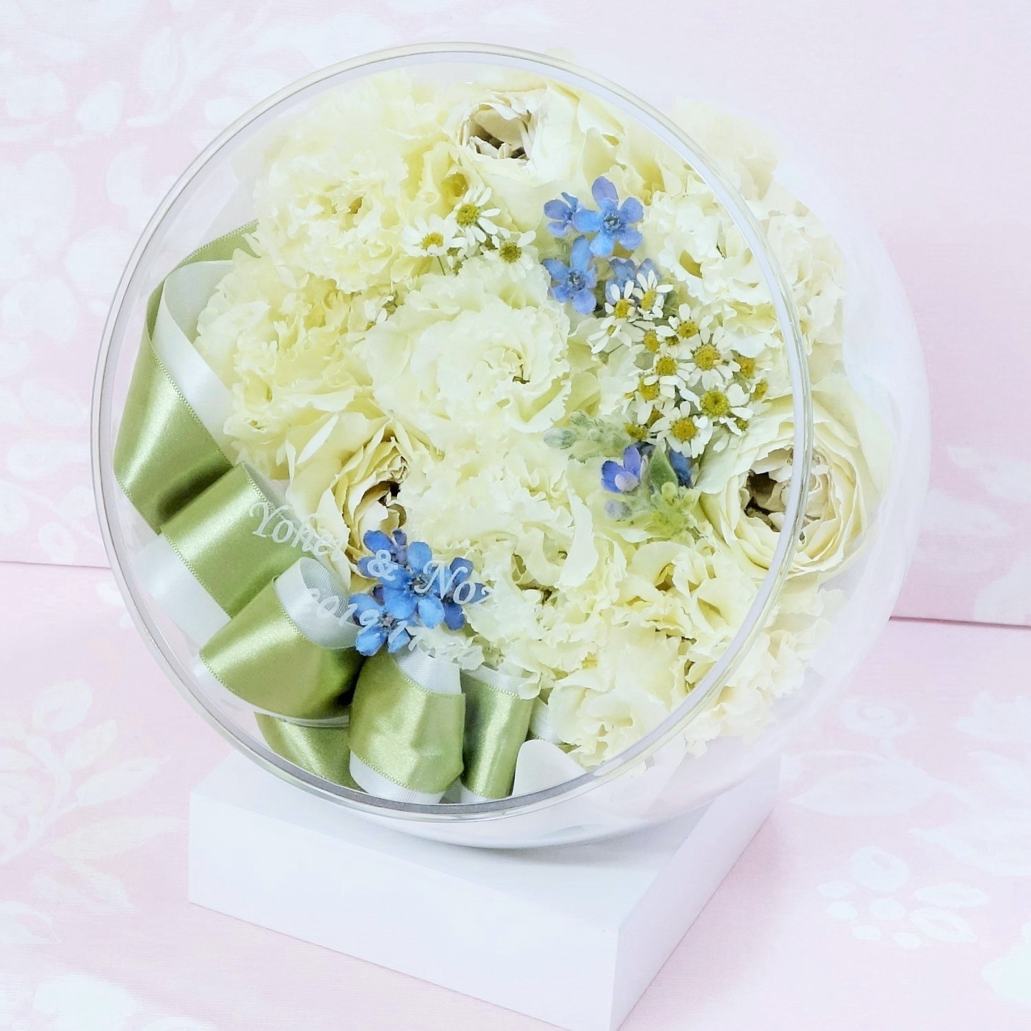 トルコキキョウや白バラ、ブルースター、カモミールなどで纏められたラウンドブーケをボトルフラワーに保存加工させて頂いたお客様からのご感想です♪