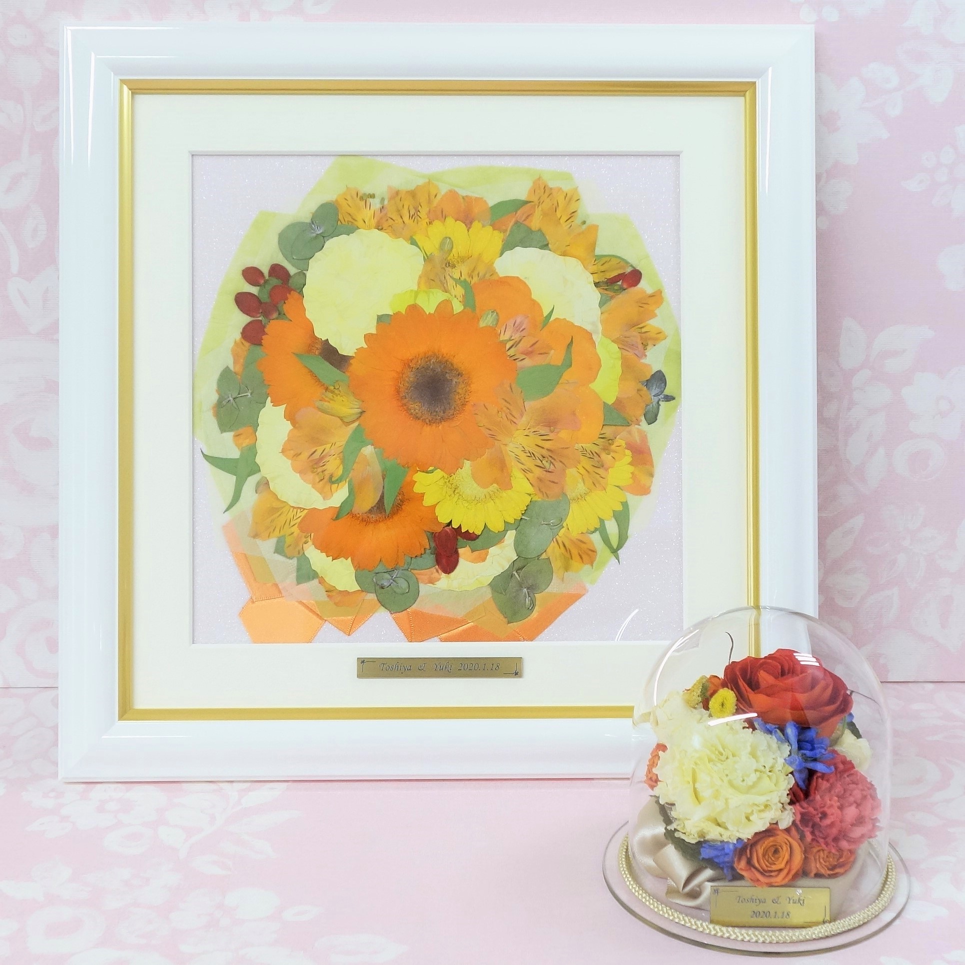 【オレンジや黄色のガーベラで纏められたブーケとオレンジ系のバラで纏められたブーケ 保存加工内容】