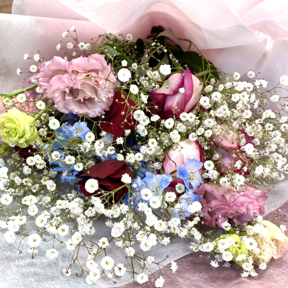 ◇◆ピンクバラや赤バラ、カスミ草、デルフィニウムなどで纏められたお誕生日花束 ビフォーアフター◆◇