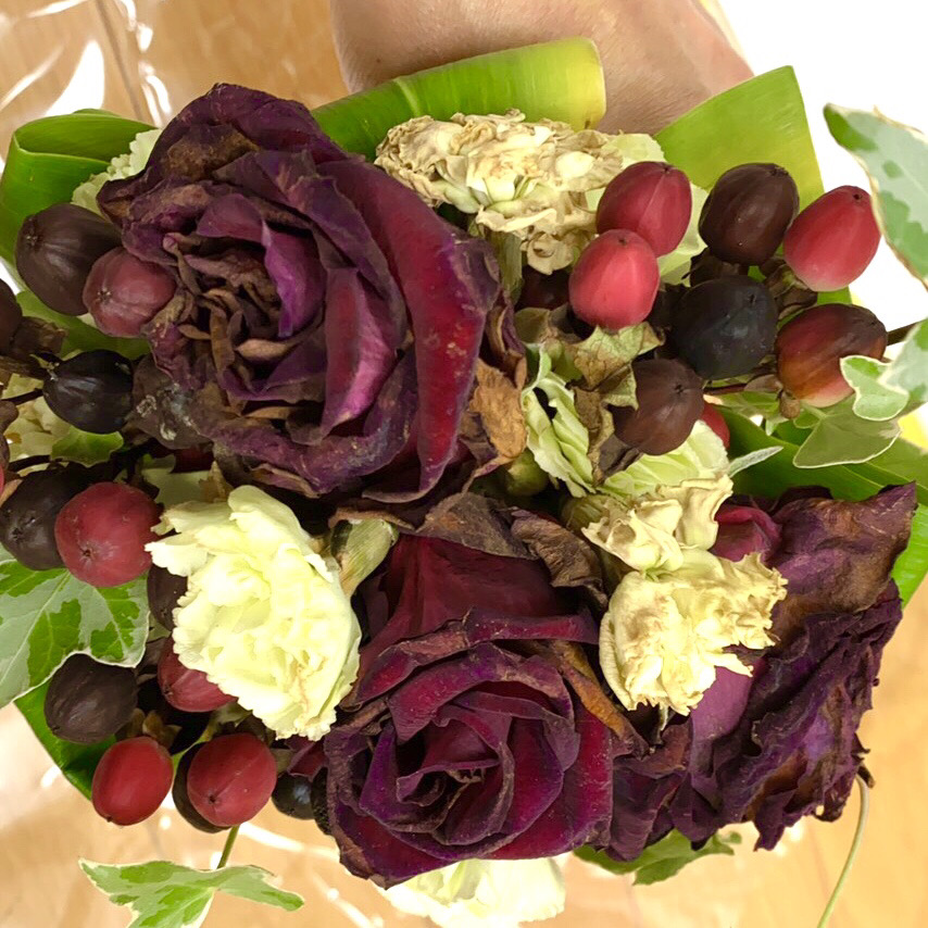 少しの生花の傷みであれば、傷みの部分をカットしながら制作することも可能です^^ブーケ・プロポーズの花束を素敵に保存させて頂きますので安心してお任せ下さいませ。