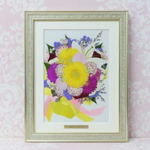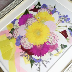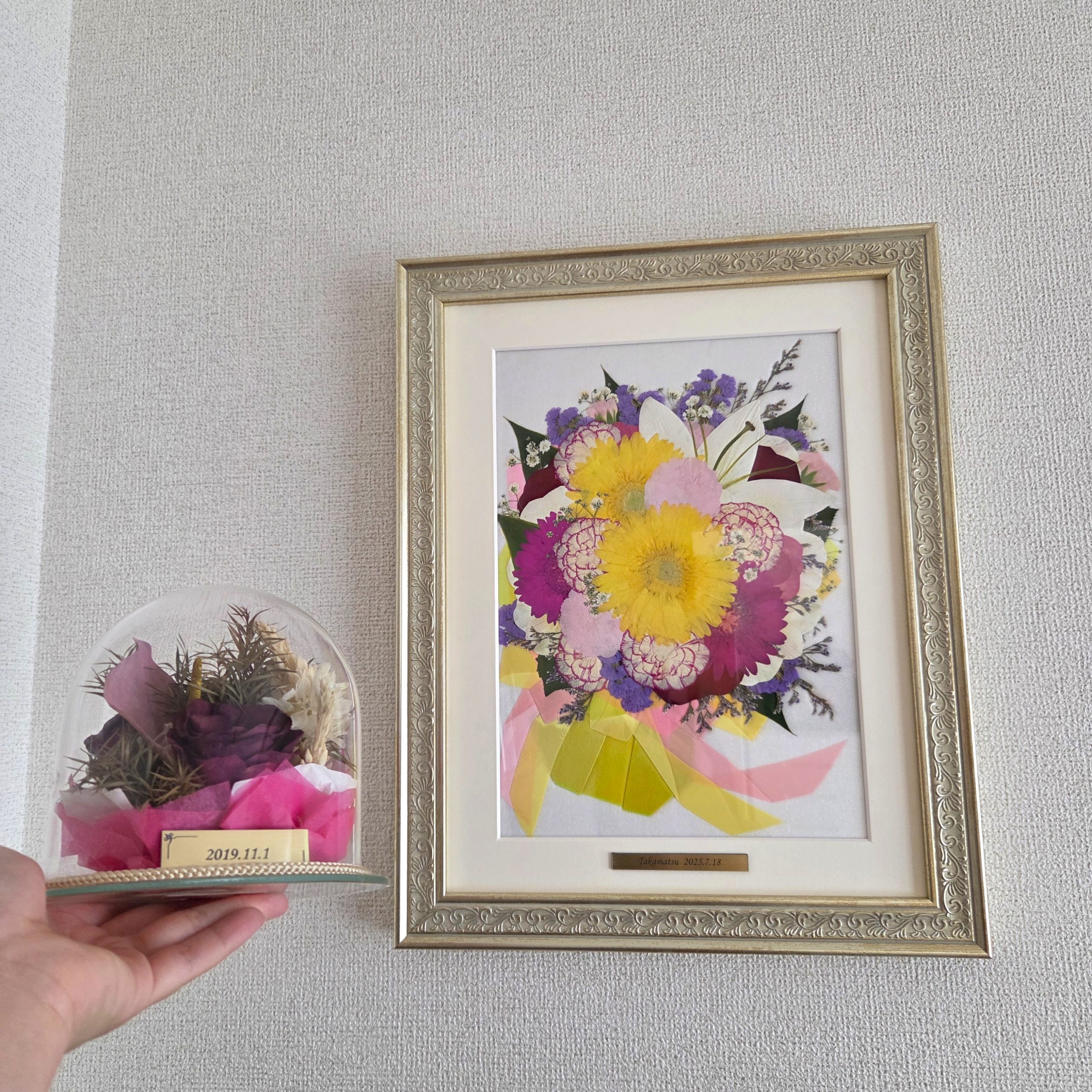 要望の通り、元の花束がそのまま押し花になったようなデザインのため、時間とともに薄れてしまう記憶を、この作品を見ることで鮮明に思い出せそうです。