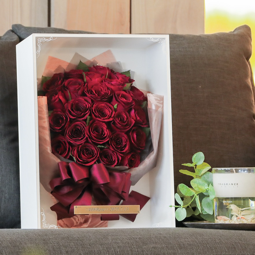 ハッピーフラワーの立体ボックスは、お花をレイアウトするだけではありません。大切な思い出を綺麗に残せるよう、お花についているラッピングやおリボンも使用して制作させていただいております。もし、ラッピングやおリボンを破棄してしまった場合も、アレンジに必要になれば、アトリエにあるおリボンを使用して綺麗にデコレーションさせていただくのでご安心ください。(おリボン代は無償で提供させていただいております)