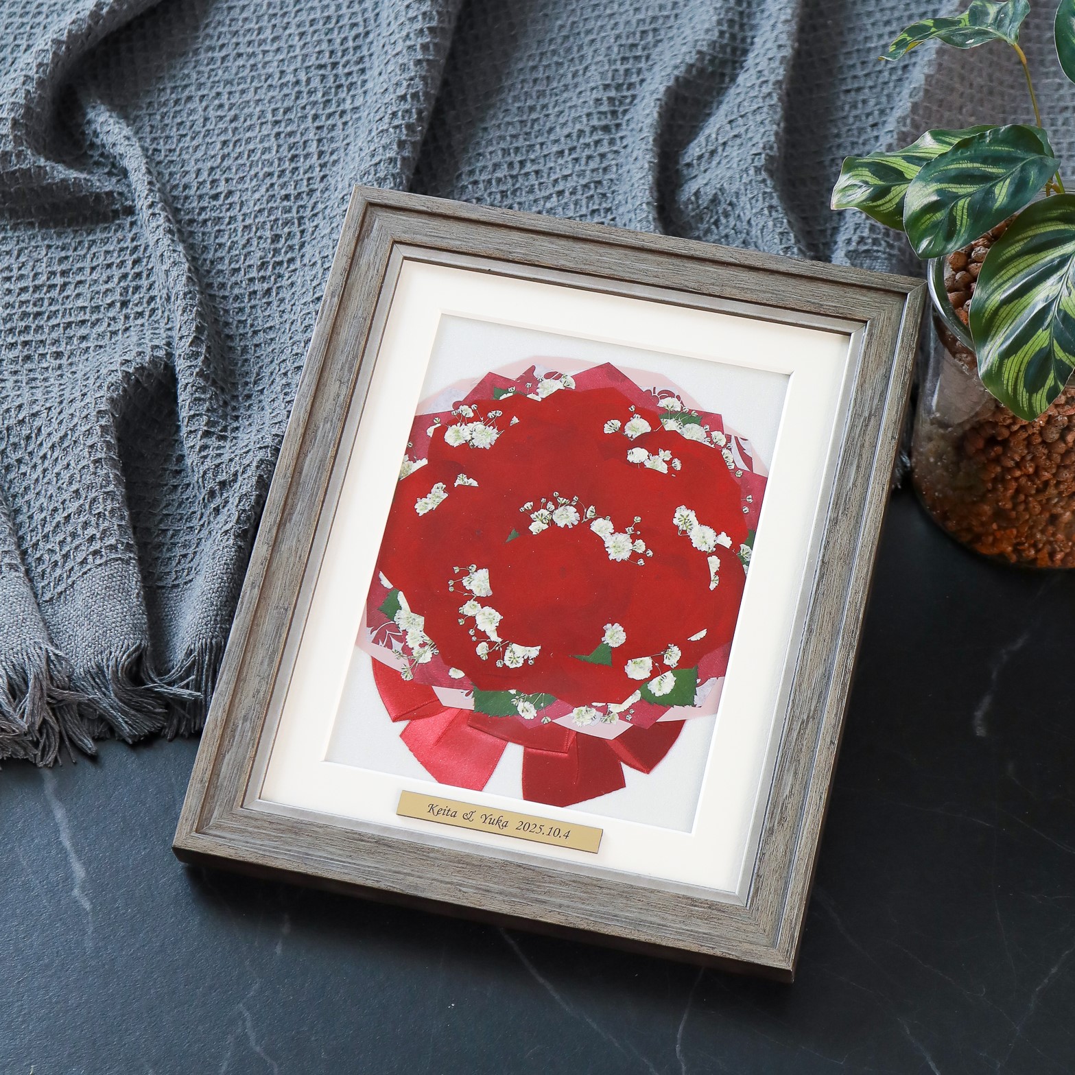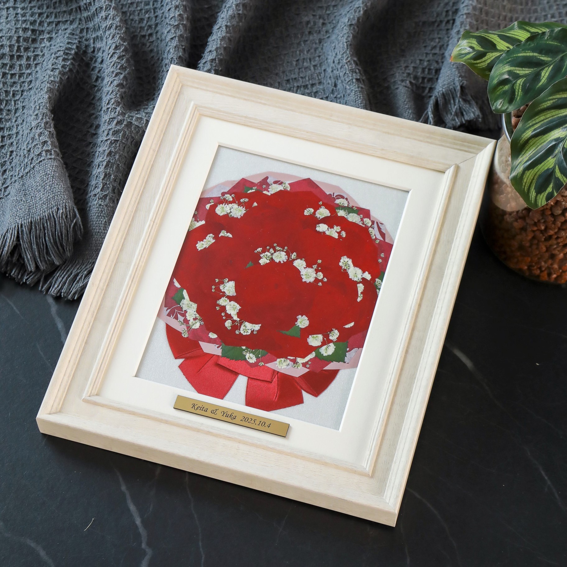 ブーケや花束をフレームサイズに合わせて縮小し、お任せデザインにてお仕上げいたします。ダーズンローズの12輪のバラの保存であれば、押し花Sサイズで制作可能です。