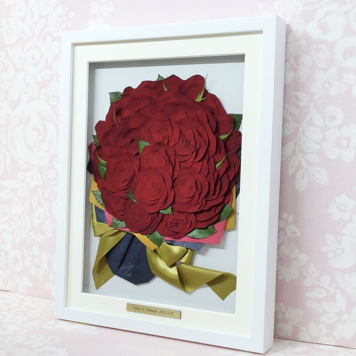 ハッピーフラワーの押し花は、お花をレイアウトするだけではありません。大切な思い出を綺麗に残せるよう、お花についているラッピングやおリボンも使用して制作させていただいております。もし、ラッピングやおリボンを破棄してしまった場合も、アレンジに必要になれば、アトリエにあるおリボンを使用して綺麗にデコレーションさせていただくのでご安心ください。(おリボン代は無償で提供させていただいております)