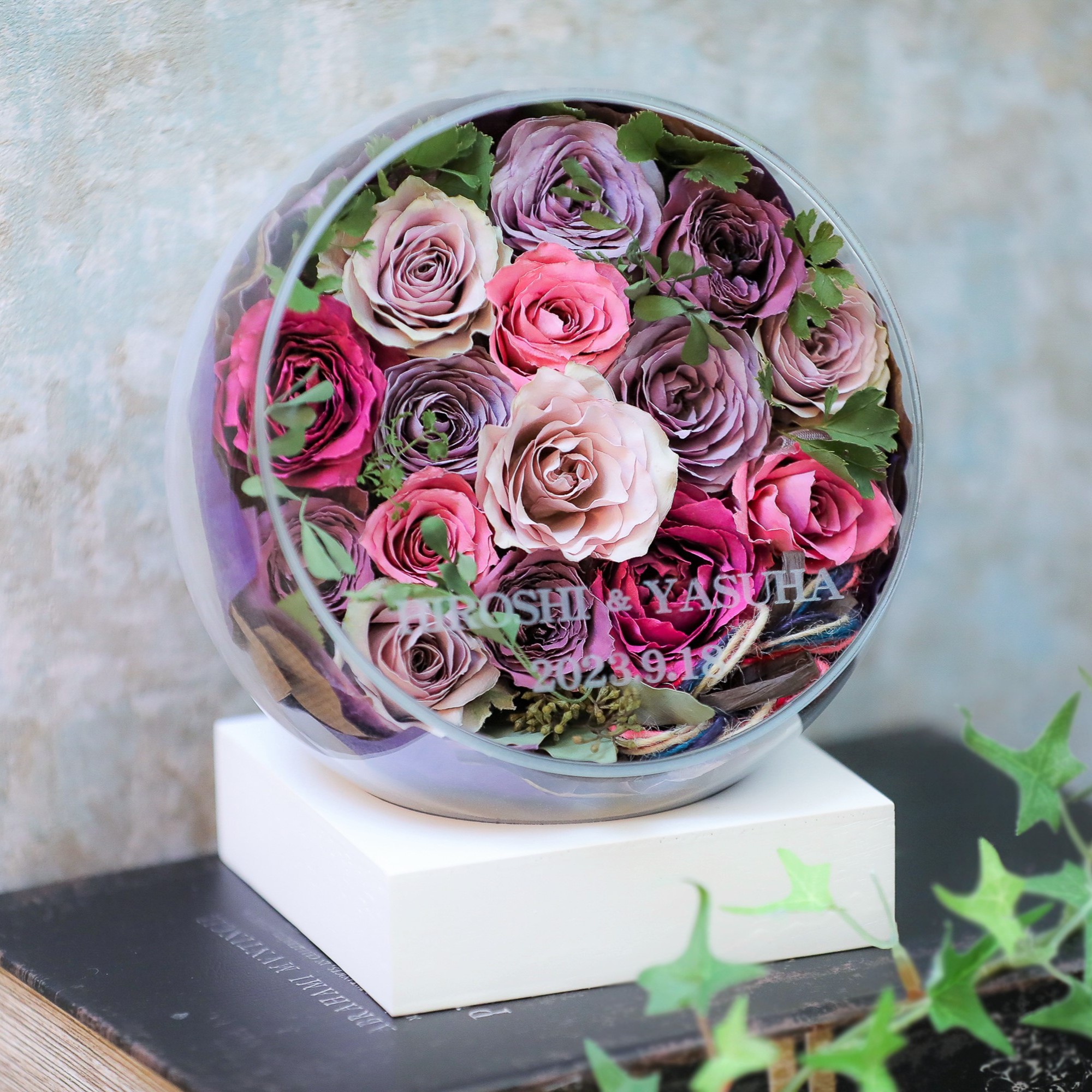丸い形状の作品のため、お花も丸みのあるバラやトルコキキョウ、カーネーションが多く使われたブーケや花束での保存がおススメ!